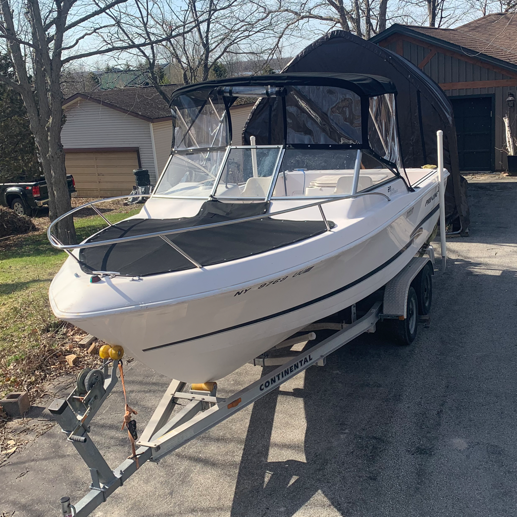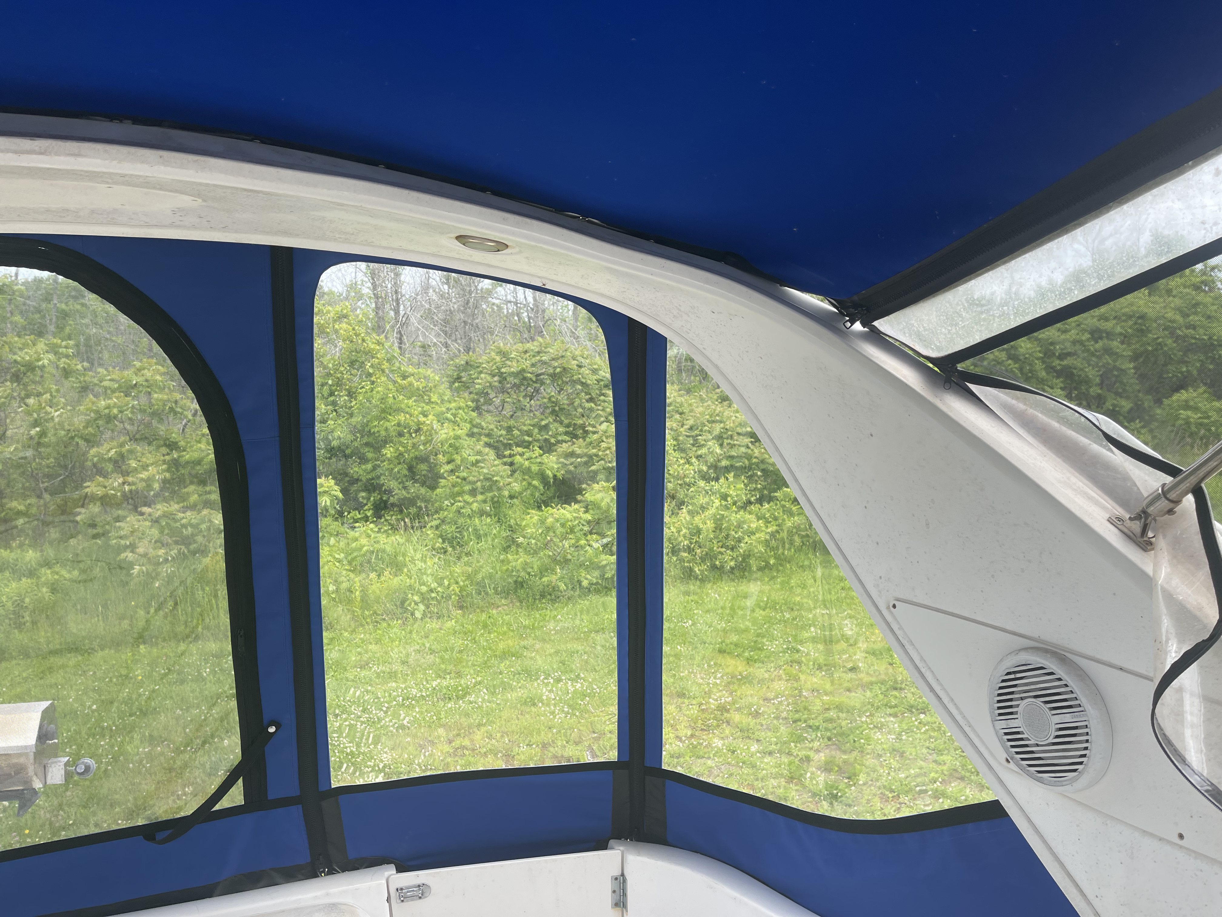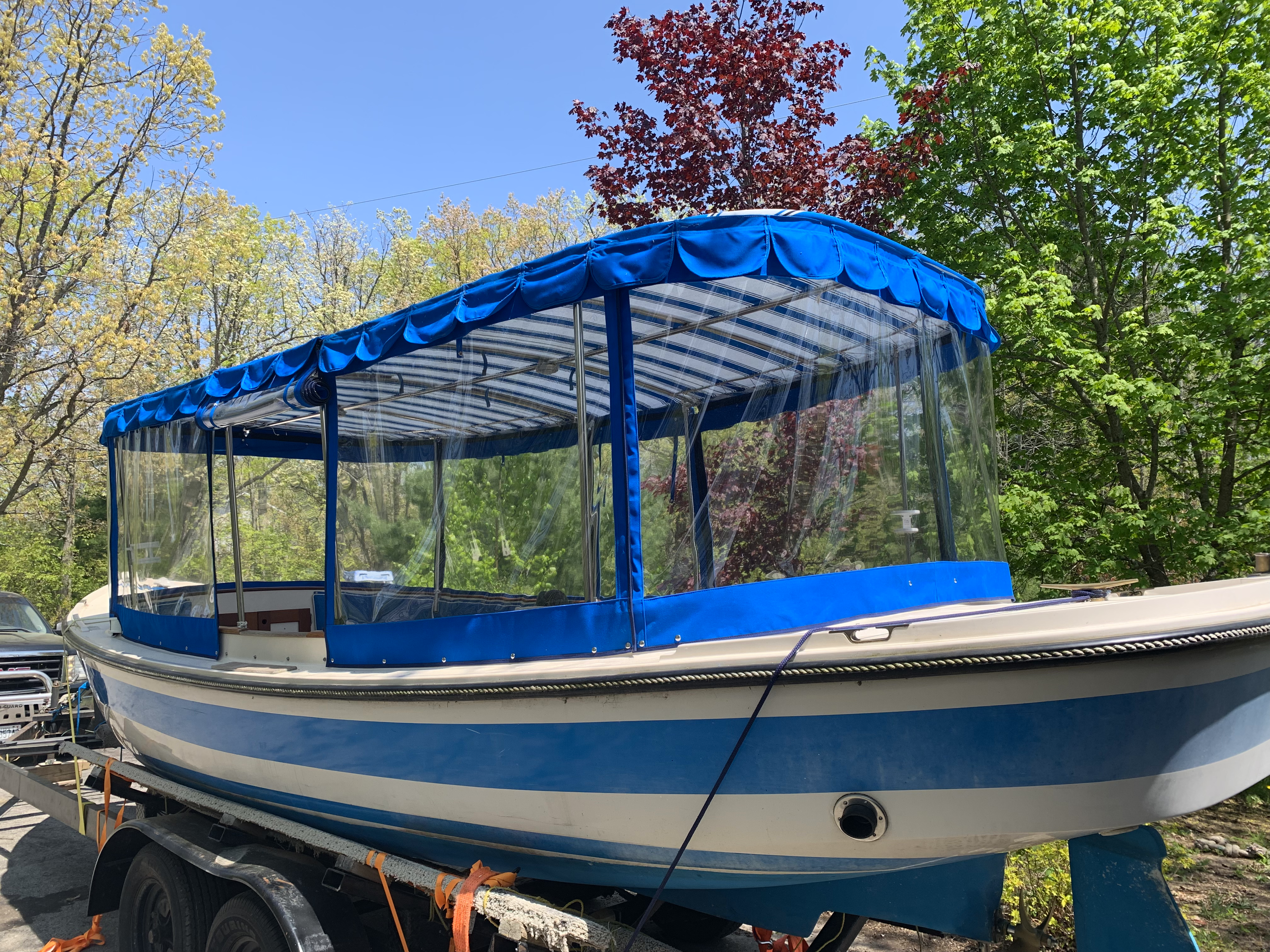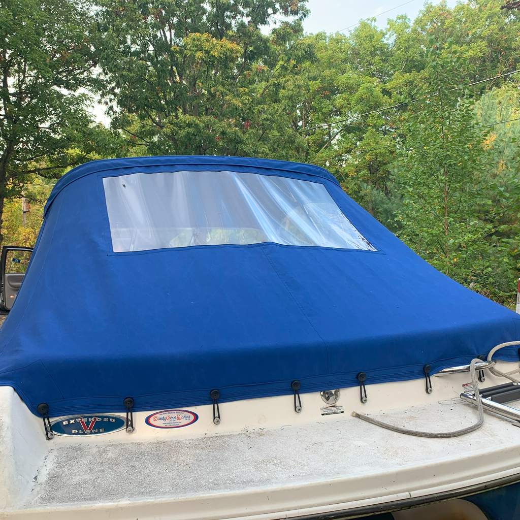 - Boat with blue canvas enclosure, Ship Shape Sewing