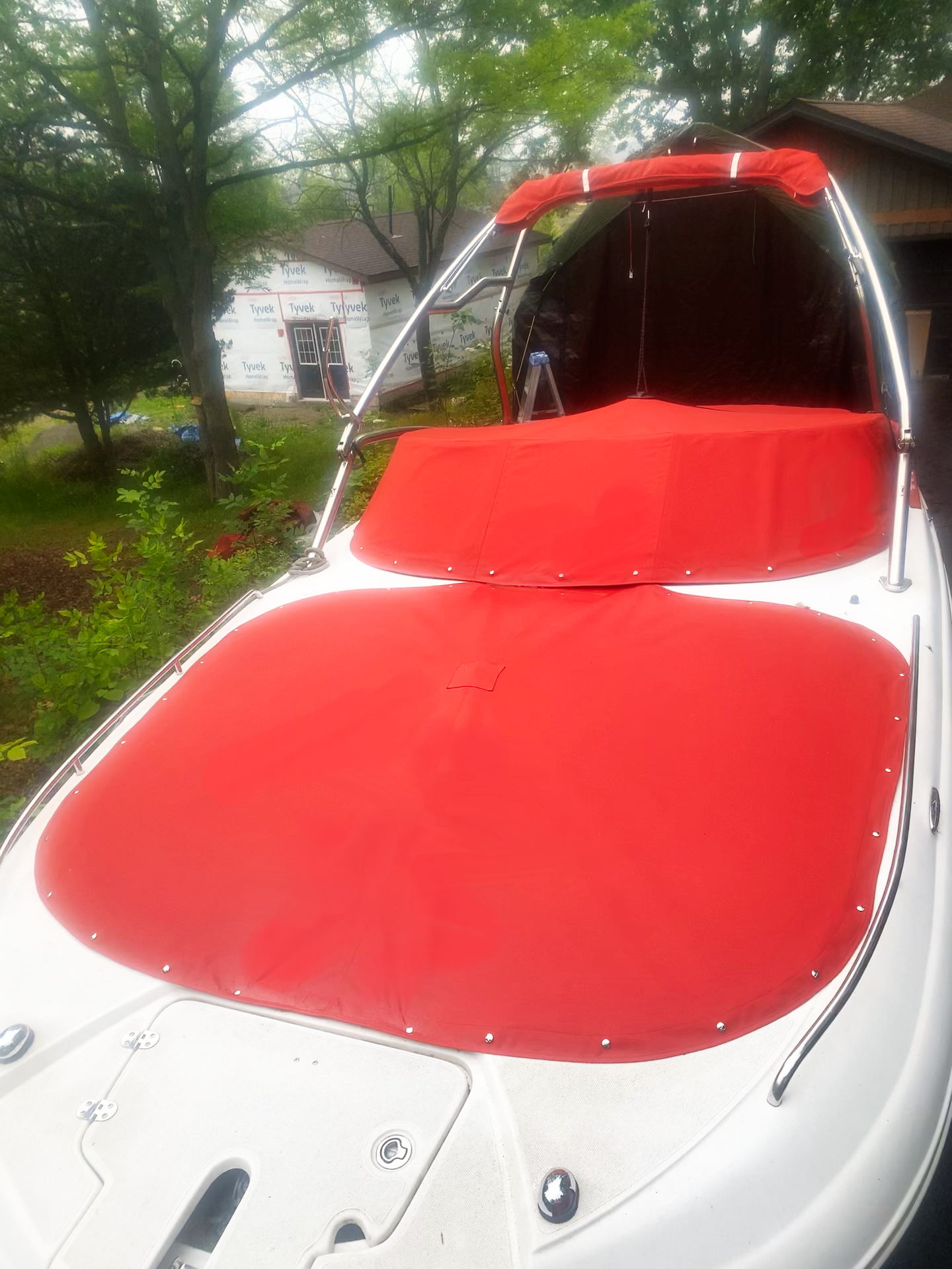 - Custom red covers on a white boat, Ship Shape Sewing work sample